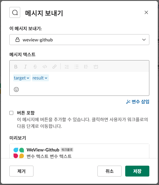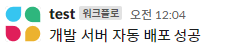 JSON으로 target과 result에 대한 값을 전달하고, 성공과 실패를 나눠서 구현했습니다. ${{ github.workflow }}는 workflow의 이름인 개발 서버 자동 배포를 의미합니다.