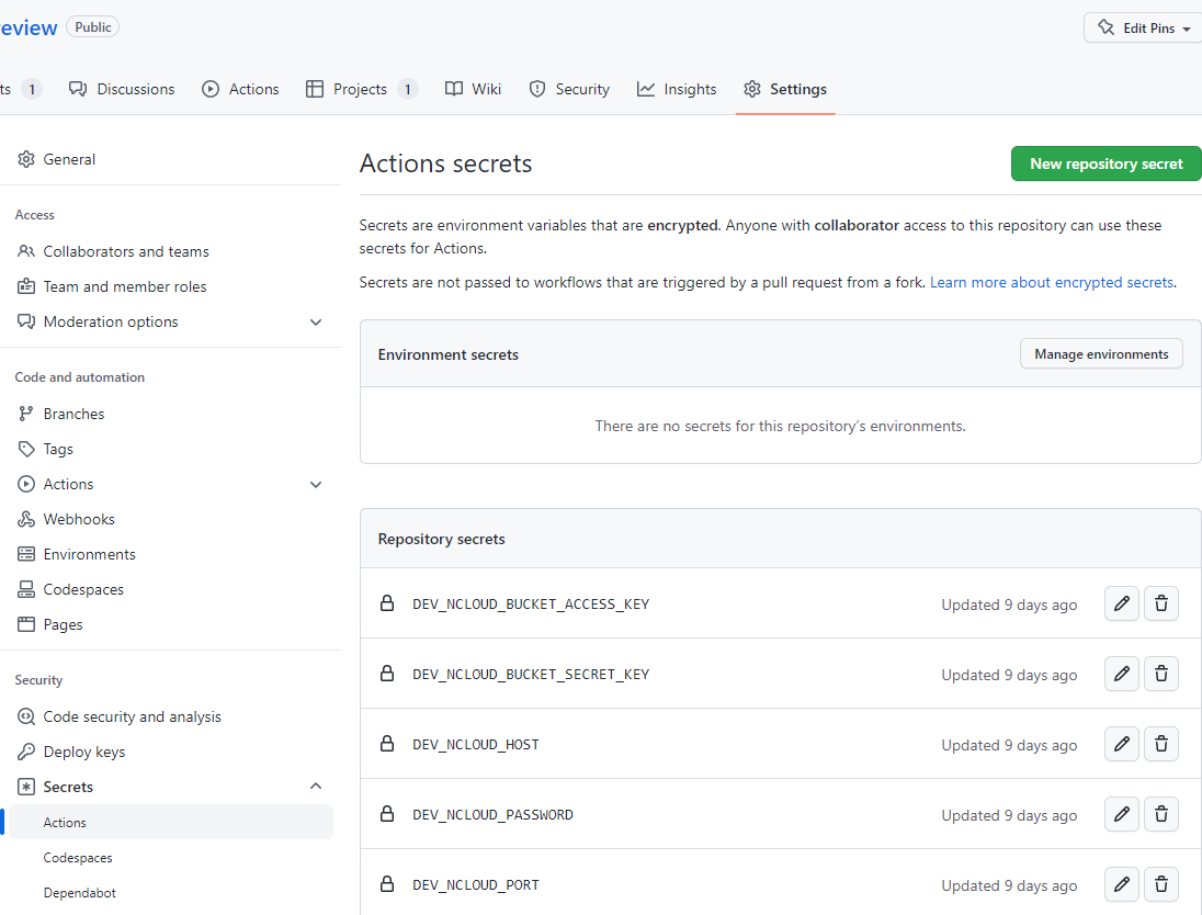 이제 깃허브 액션에 적용하는 일만 남았습니다. 그 전에 깃허브 액션의 secrets을 등록해줘야 합니다. 이 작업은 굉장히 단순합니다.
