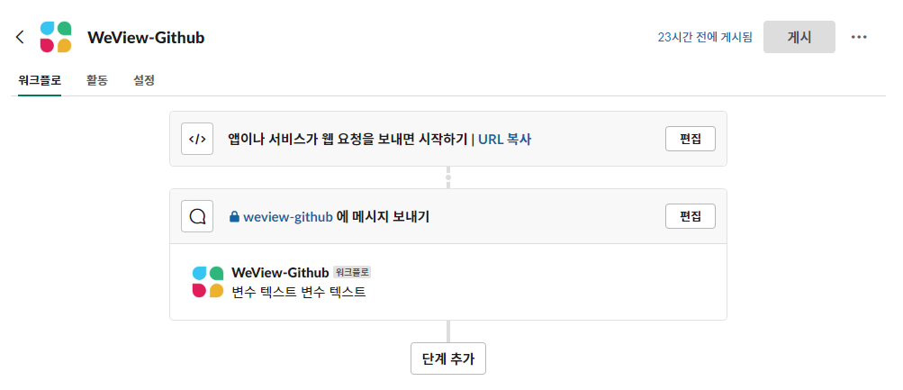 위 기능은 슬랙의 workflow를 사용하는 것인데 방식은 간단합니다. workflow를 게시하면 생성되는 URL에 POST 요청을 보냈을 때 수행될 일련의 작업들을 정의하는 겁니다.