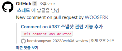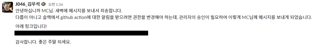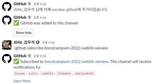 만약 이 글을 보고 도입을 고려하고 계신 분이라면 슬랙 내의 깃허브 앱으로 간편하게 도입하는 방식을 사용하시길 바랍니다.