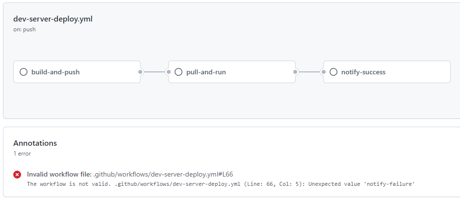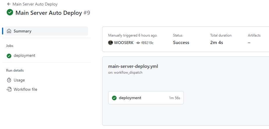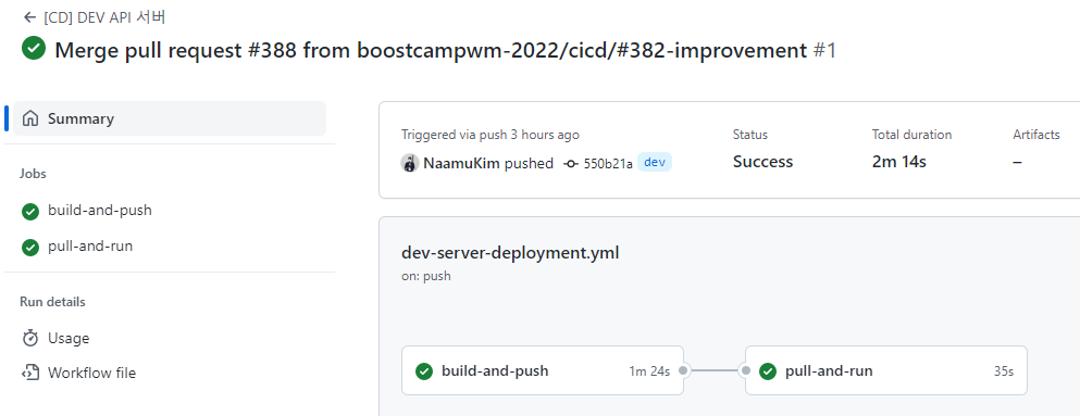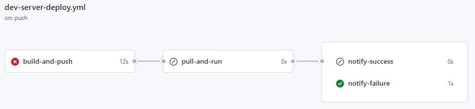 하지만 저희의 배포 workflow는 push → pull의 과정이기 때문에 순차적으로 수행되어야 합니다. 따라서 job을 분리할 경우 각 job이 수행될 때마다 환경을 세팅하는 시간이 추가적으로 소요됩니다.