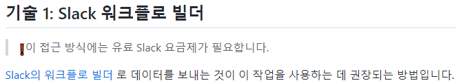 해당 기능은 기본 설정에 포함되어 있지 않기 때문에 명령어 한 줄을 추가적으로 입력하면 적용됩니다. 대신 슬랙에게 workflow에 대한 접근 권한을 허용해야 합니다.