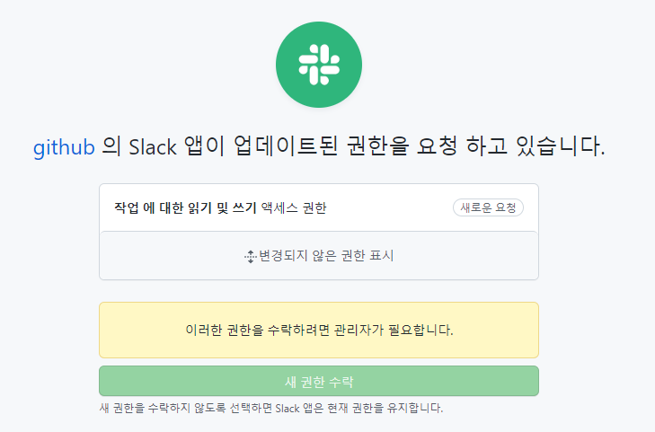 관리자님께서 권한 승인을 해주셨습니다. 따라서 온전히 슬랙만으로 깃허브 알림을 받을 수 있게 된 것입니다.