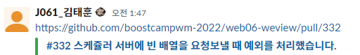 저희는 여태까지 슬랙에 PR을 직접 링크하여 서로에게 리뷰를 요청했습니다. 아래처럼요.