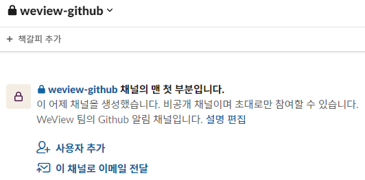 저희는 여태까지 슬랙 DM으로 소통했는데, 슬랙과 깃허브를 연동하기 위해서는 채널이 필요하기에 우선 슬랙에 채널을 만들었습니다.