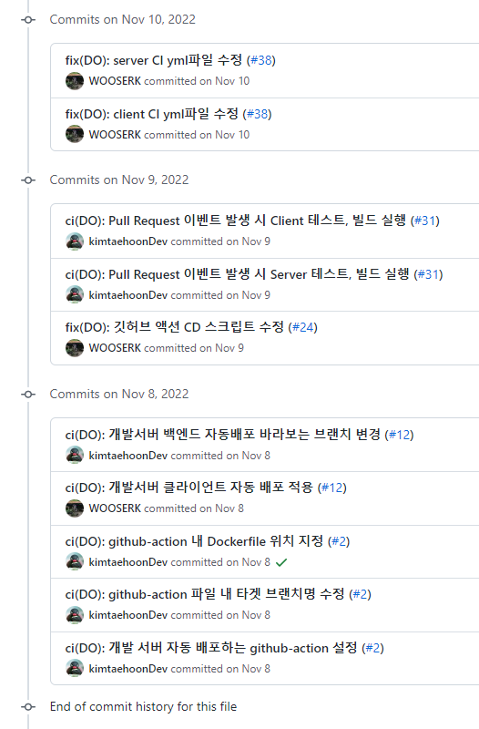 처음에는 편리함이 컸습니다. 프로젝트 시작이 11월 7일인 것을 감안하면 저희는 거의 시작과 동시에 CI/CD를 구현했기 때문입니다.