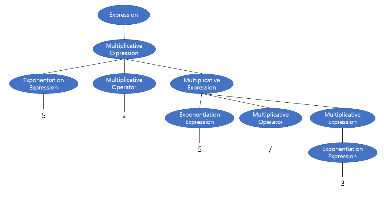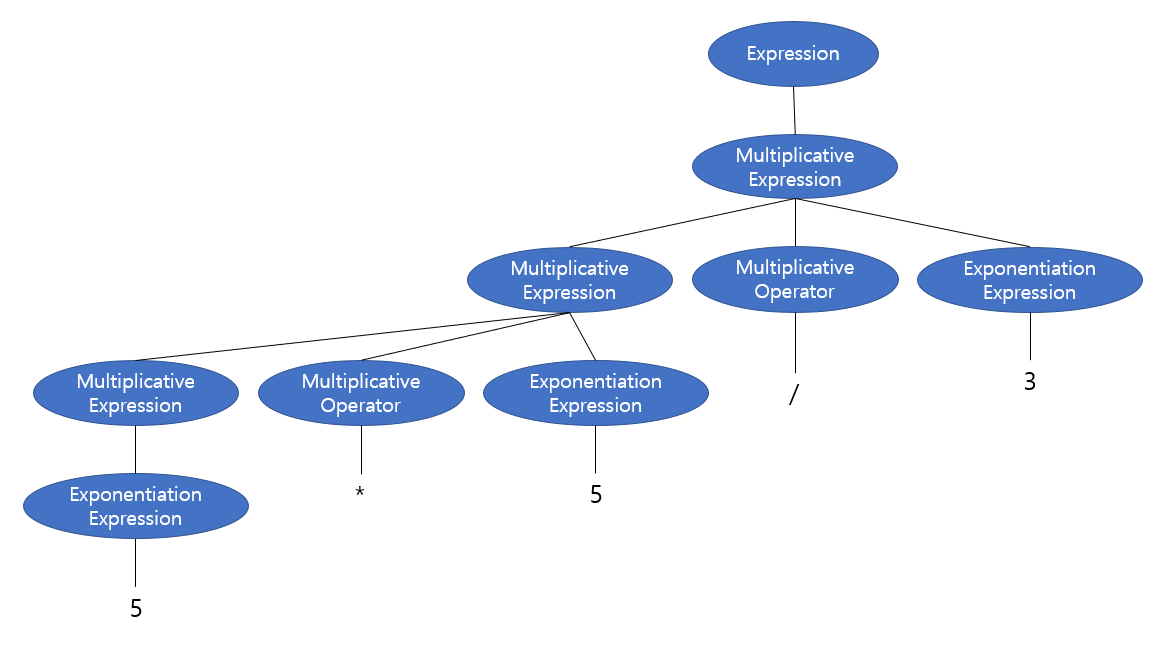 parse 트리는 가장 아래에서부터 연산을 한다고 했습니다. 따라서 5*5이 먼저 수행되고, 그 결과가 3과 나눠집니다. 따라서, 같은 우선순위인 *와 / 중 왼쪽의 * 연산이 먼저 수행되므로 좌->우 결합 방향을 가집니다.