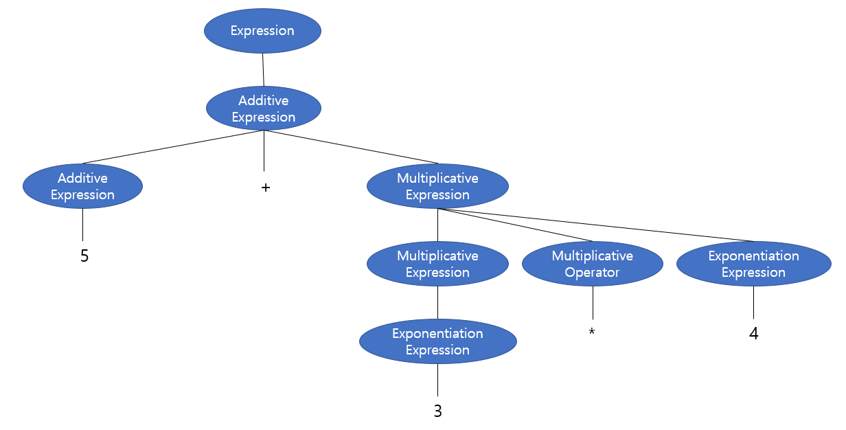 위 두 BNF에 따라 5+3*4는 다음과 같은 트리로 만들어집니다. 사실 다른 BNF도 봐야하지만 간소화했습니다. 이해하지 않으셔도 괜찮습니다.