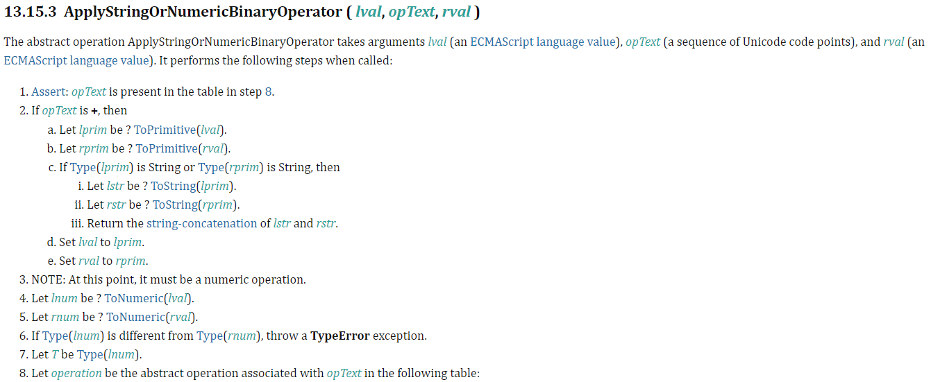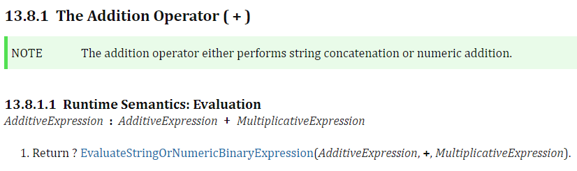 양쪽 피연산자를 primitive 타입으로 변환합니다. 이때, 한쪽이라도 String 타입이라면 양쪽을 문자열로 변환하여 합친 후 반환합니다. ToString()으로 문자열로 변환할 수 없으면 TypeError를 발생시킵니다. (ex. Symbol 타입)